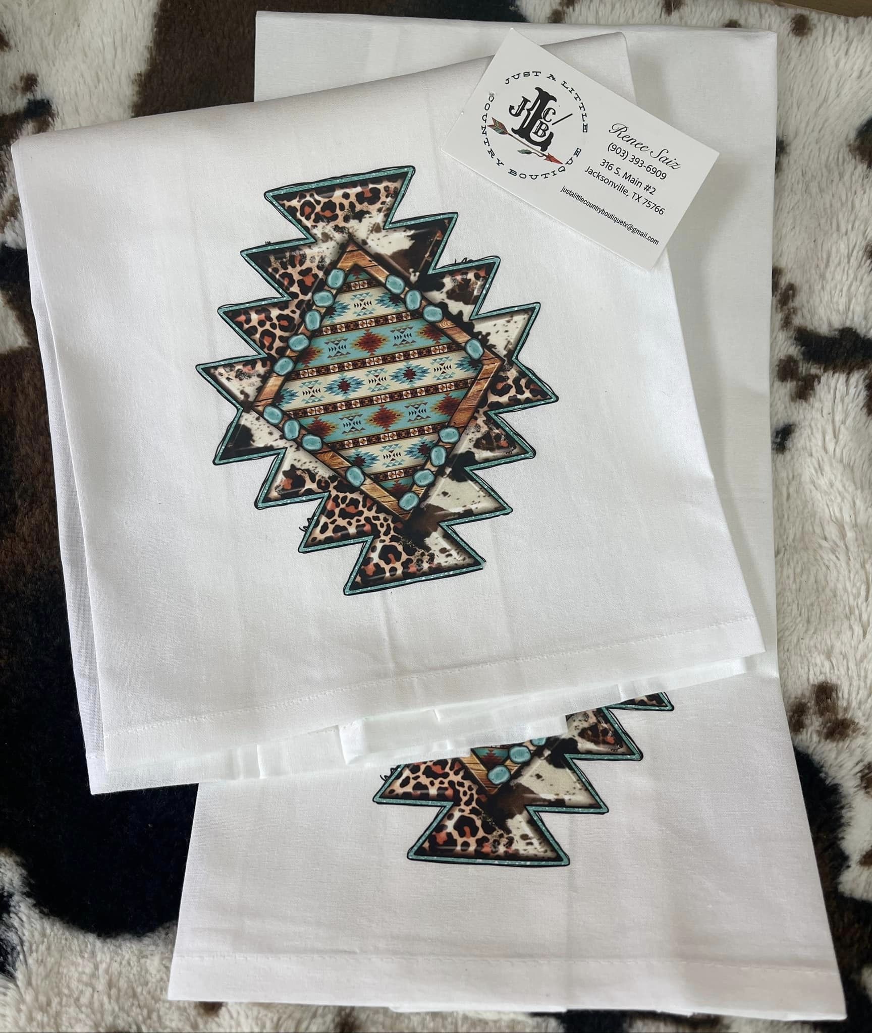 Spice up your kitchen with our Aztec and Leopard flour sack towels. This set of 2 features a unique western design, adding a touch of whimsy to your home. Made from high-quality flour sack material, these towels are both functional and stylish. Yee-haw!