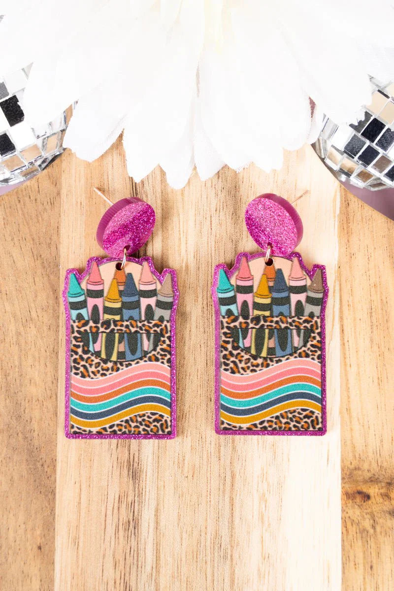 Show your love of creativity with these cute COLOR THE WORLD EARRINGS! Constructed from acrylic and embellished with glittering accents, these 2” post style earrings will add sparkle to any outfit. Perfect for those who teach and inspire- now let’s color the world!