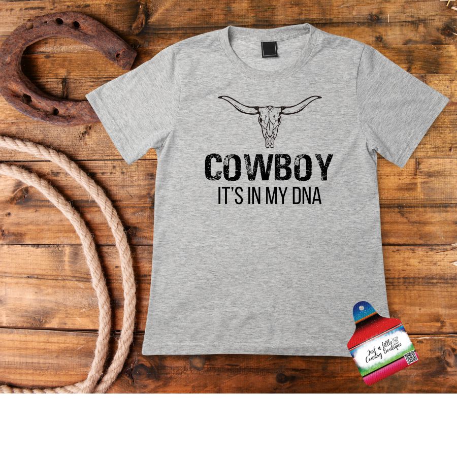 Show off your cowboy roots with our "COWBOY It's in my DNA" t-shirt. The cute DTF design adds a playful touch to this soft and comfortable tee. Perfect for all the little cowboys out there!
