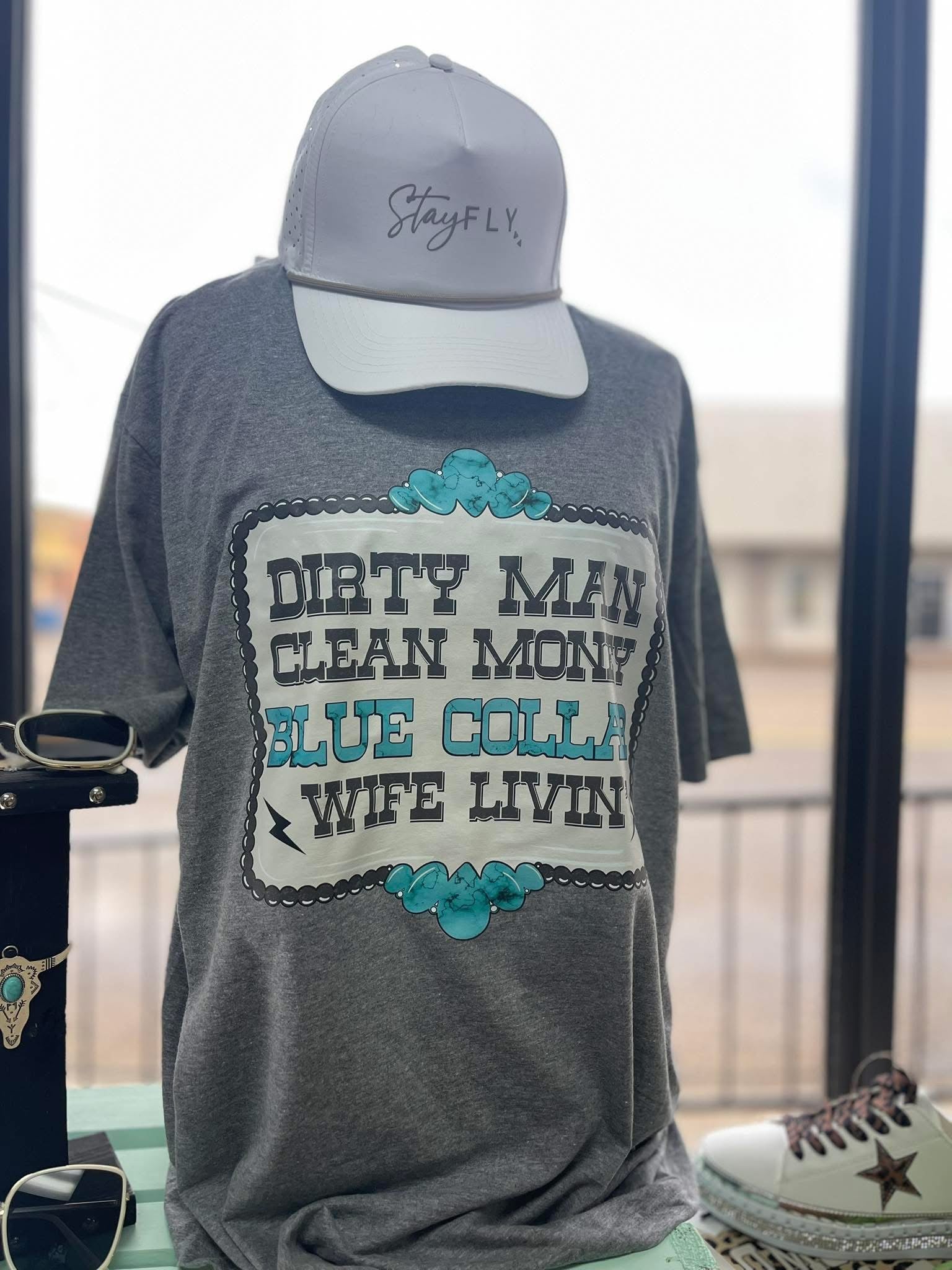 Get ready to rock this soft, unisex t-shirt with a bold "DTF" print design. Show your support for blue collar workers and the hustle with "Dirty man, clean money". Perfect for the tough and hard-working, this shirt celebrates the strength and support of a woman in the “blue collar life".