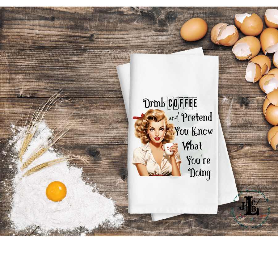 Add some humor to your coffee bar with our "Drink Coffee and Pretend" flour sack towel. Perfect for those who need a little boost of confidence while sipping their morning brew. Now you can drink your coffee and pretend you know what you're doing. No judgment here (wink).