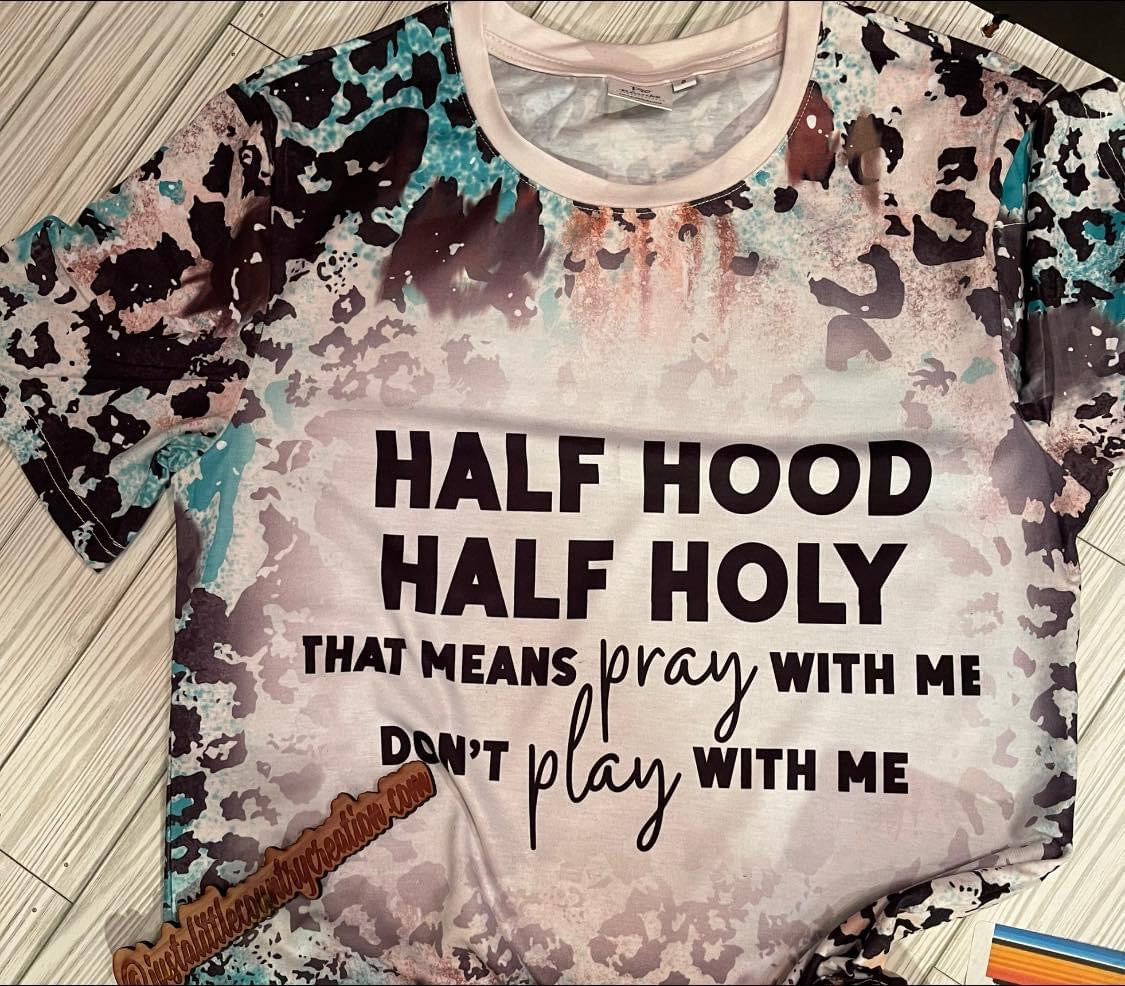 Be part churchgoer, part hoodlum with this unique, hybrid-style t-shirt! Made from breathable polyester fabric, the Half Holy/Half Hood t-shirt features leopard and faux bleach print design and a cheeky phrase: "Pray with me don't play with me". Put a holy spin on your streetwear!