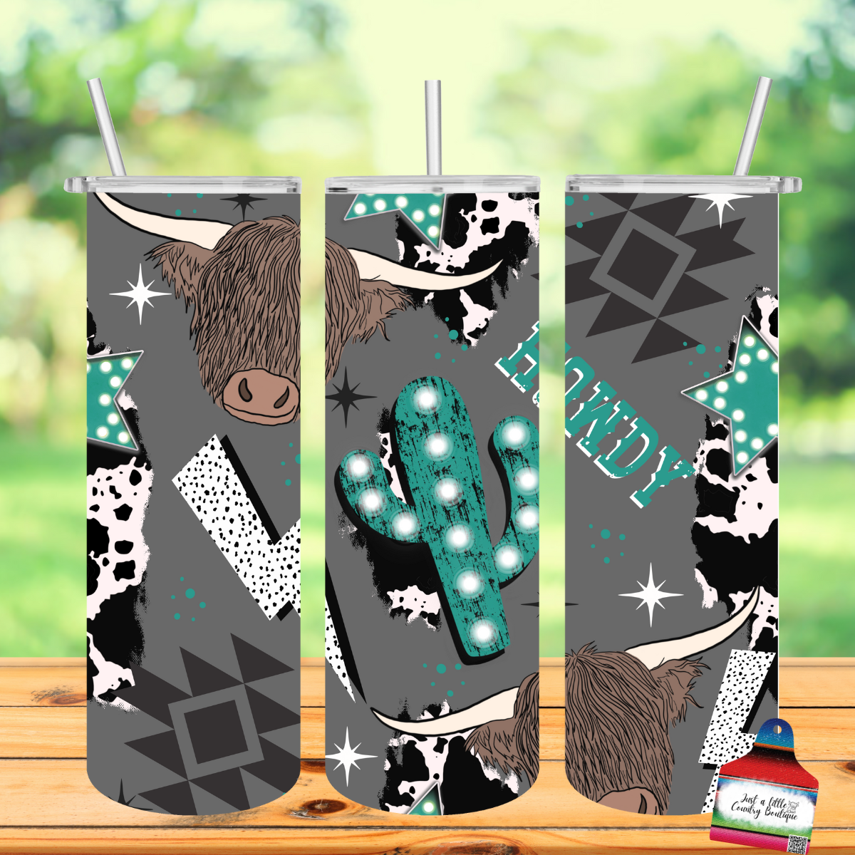 Sustain your savory sips in style with the Highland Howdy! This 20 oz sublimation tumbler features a playful cactus aztec print and a striking lightening bolt design. Quench your thirst on-the-go and turn heads with this quirky, must-have accessory. Tumble into fun with every sip!