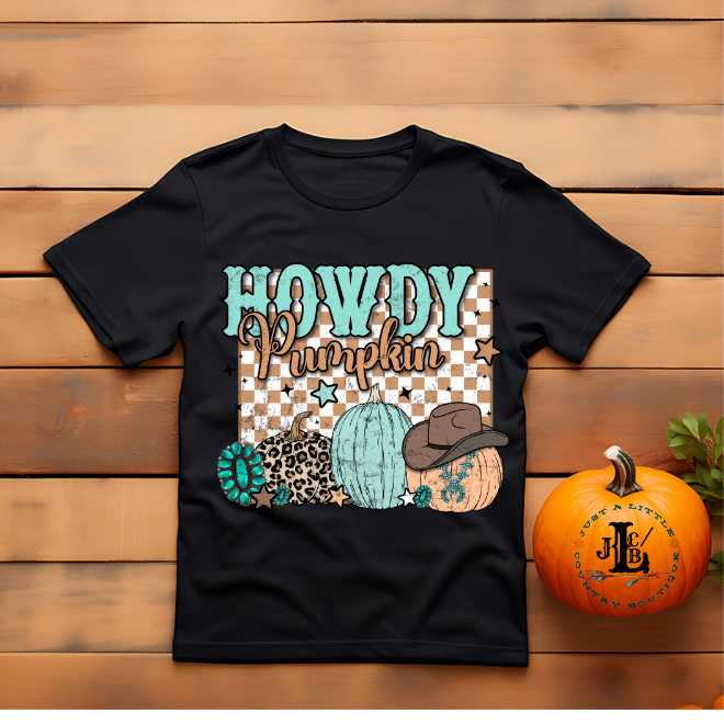 "Howdy Pumpkin!" This soft blended Tshirt features a playful western design that is DTF (down to fall) with turquoise and pumpkins, making it every girl's favorite season. Get ready to be the talk of the pumpkin patch!