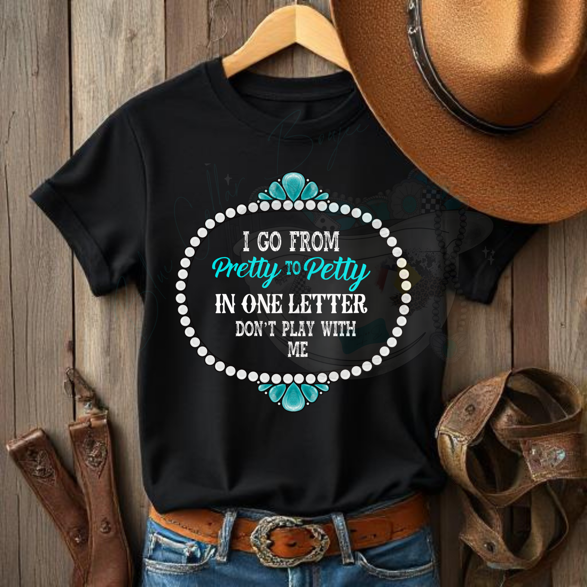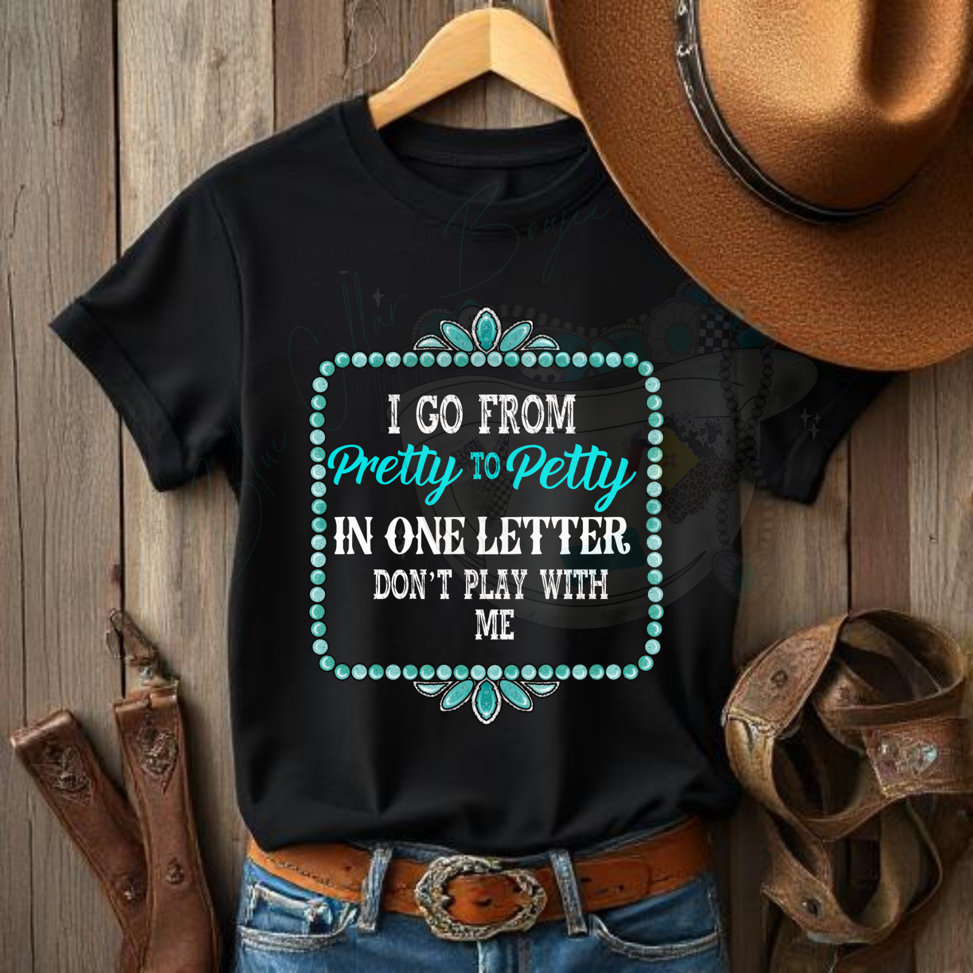 Unleash your inner sass with our 'I go from Pretty to Petty' soft unisex t-shirt with DTF Print. Choose color in comment box. Show off your DTF (Down to Flaunt) attitude and let the world know you're not afraid to get a little petty.