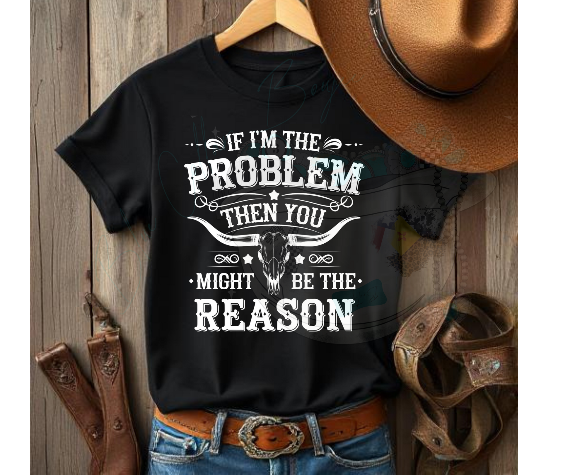Declare your playful, sassy attitude with this soft unisex t-shirt that reads 'If I'm the problem, you must be the reason' in a western-inspired font. Perfect for making a statement or just for fun. Black T-shirt with DTF transfer (Direct- to-film)