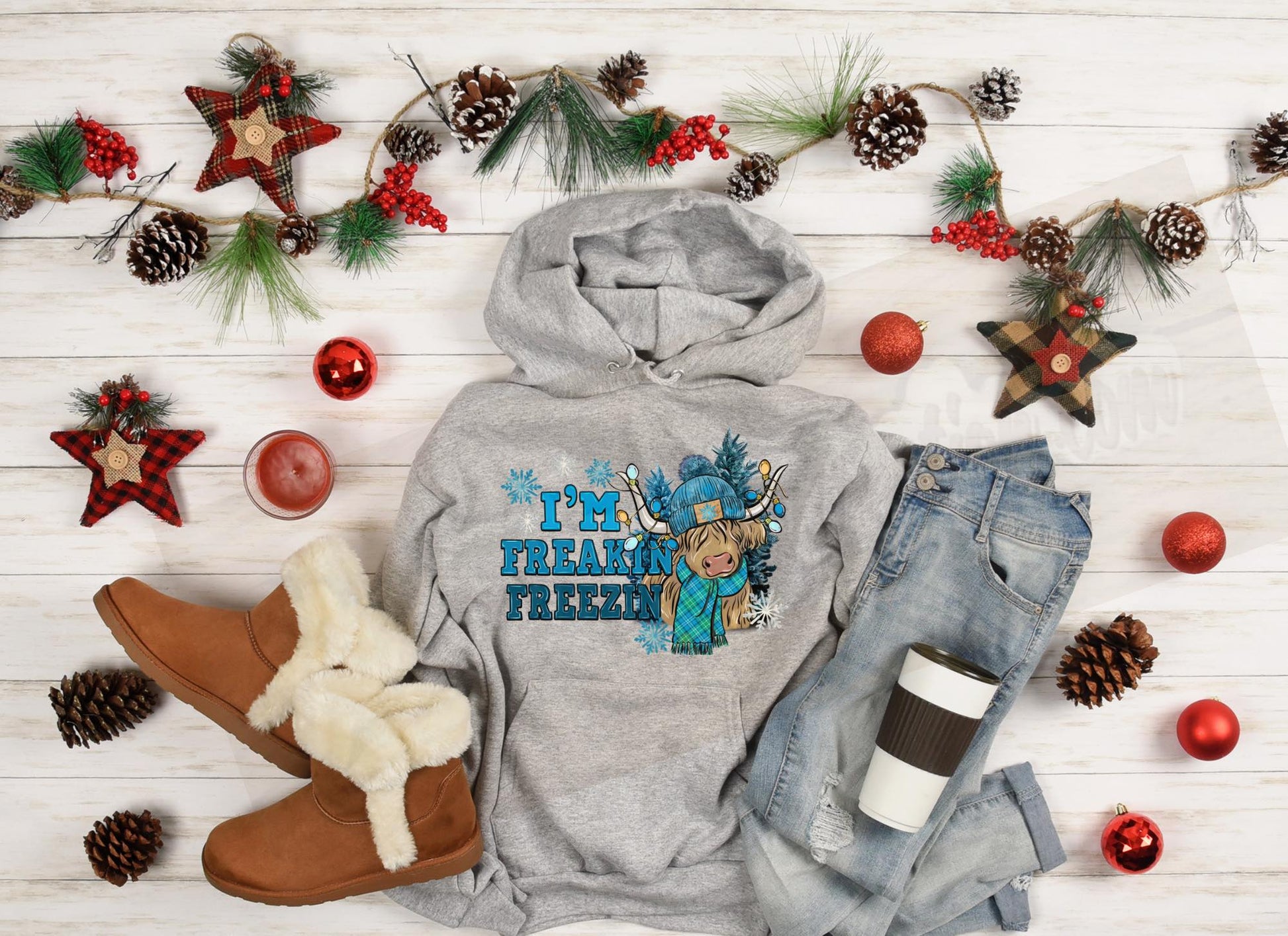 Bundle up in style with this adorable "I'm Freaking Freezin'" hoodie! This soft blended hoodie features a Highland Cow design perfect for winter, so you can stay warm while looking cute! Stay toasty and trendy all winter long!