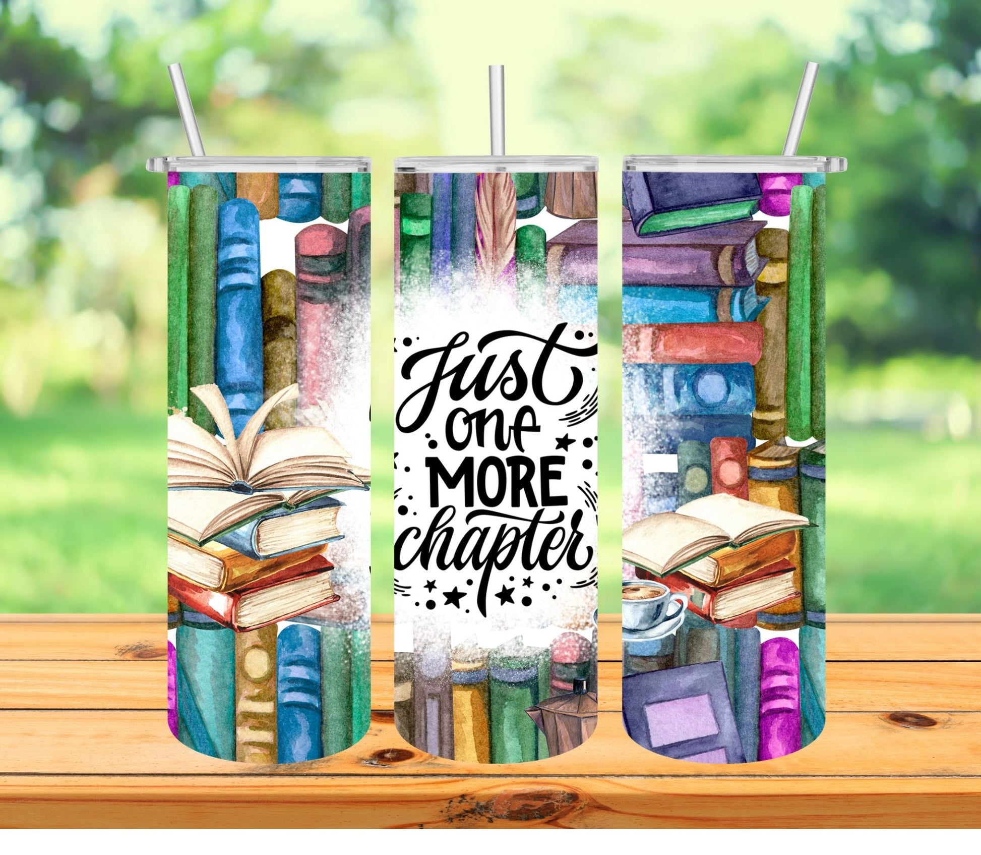 This thrifty tumbler is the perfect thing for the book fanatic in your life looking for Just One More Chapter. Its stylish design is brightly sublimated, so you can curl up with a colorful cup of joe and a good novel. Just don't forget to put the book down to wash up.