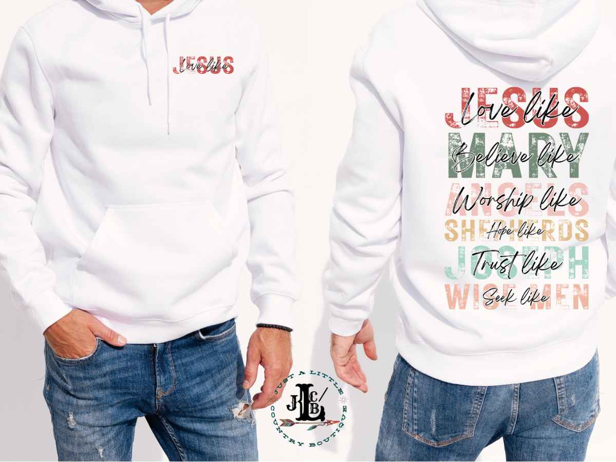 Spread love like Jesus in this soft hoodie. Available in your desired color (just let us know in the notes)! With this DTF (Down To Faith) print, you'll be spreading good vibes wherever you go. (Pun intended.)