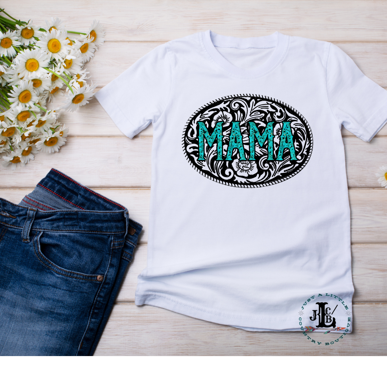 Rock this MAMA BUCKLE t-shirt with a Western-inspired design and DTF print. Made from soft blended material and featuring a buckle look, it's stylish and comfortable for any occasion. (Moms, this one's for you!)