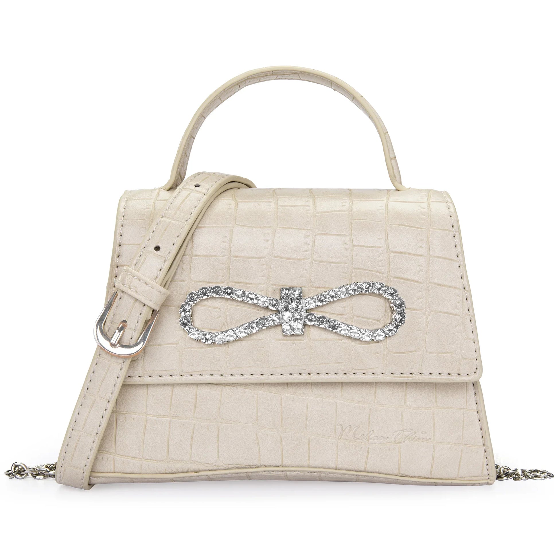 Take a walk on the wild side with the Milan Chiva Crocodile Crossbody Bag! The crocodile texture pattern adds an exotic touch, while the bowknot and crystal studs add a touch of glam. Keep your essentials organized with the main compartment and interior zipper pocket, and switch up your look with the detachable chain strap.