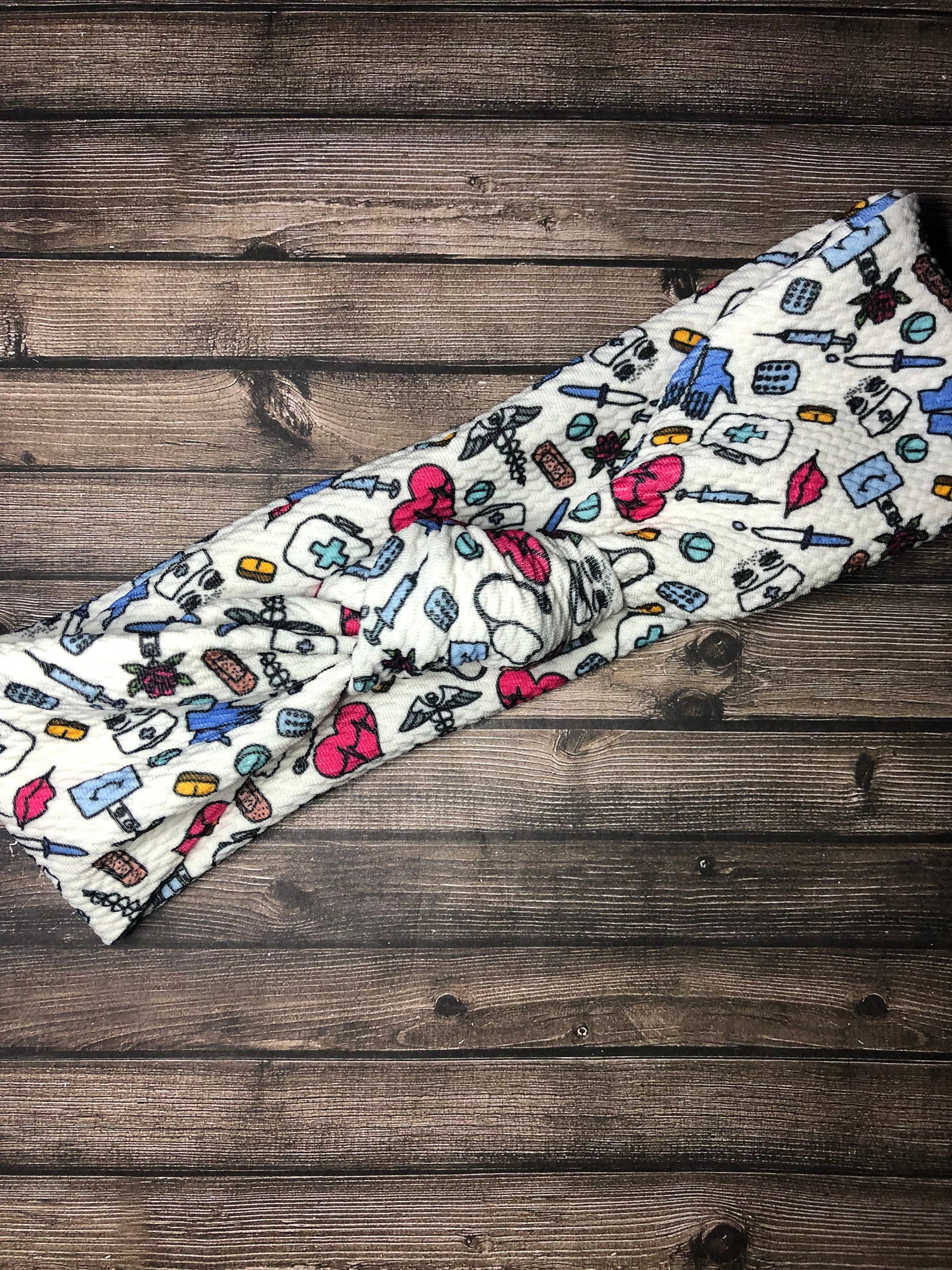 This nursing/medical print knotted headbands is the perfect addition to join the popular growing trend of cow print. This nursing print headband is made from bullet fabric. It is super soft and stretchy. It is cut from 24 inches of fabric and when sewn is approximately 2 inches wide. I pre-wash all of my fabric, and it is made in a smoke-free and dog friendly home. Slight variations may occur since all items are handmade.