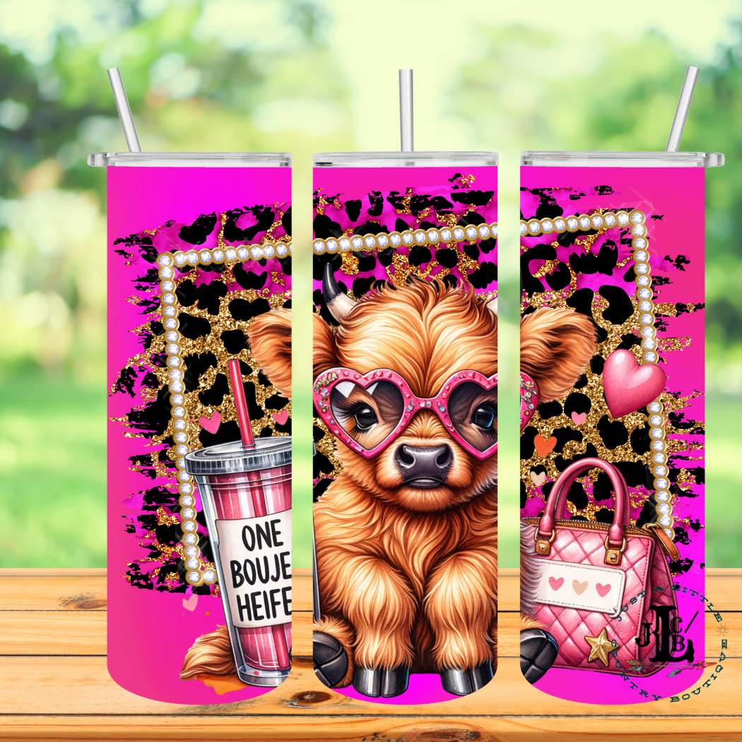 Quench your thirst with One Boujee heifer, the 20 oz sublimated tumbler with a stylish twist. Keep your drinks hot or cold for longer without any annoying condensation. Adorned with a cute highland cow design in hot pink and chetah print, this tumbler is perfect for any fun-loving beverage lover.