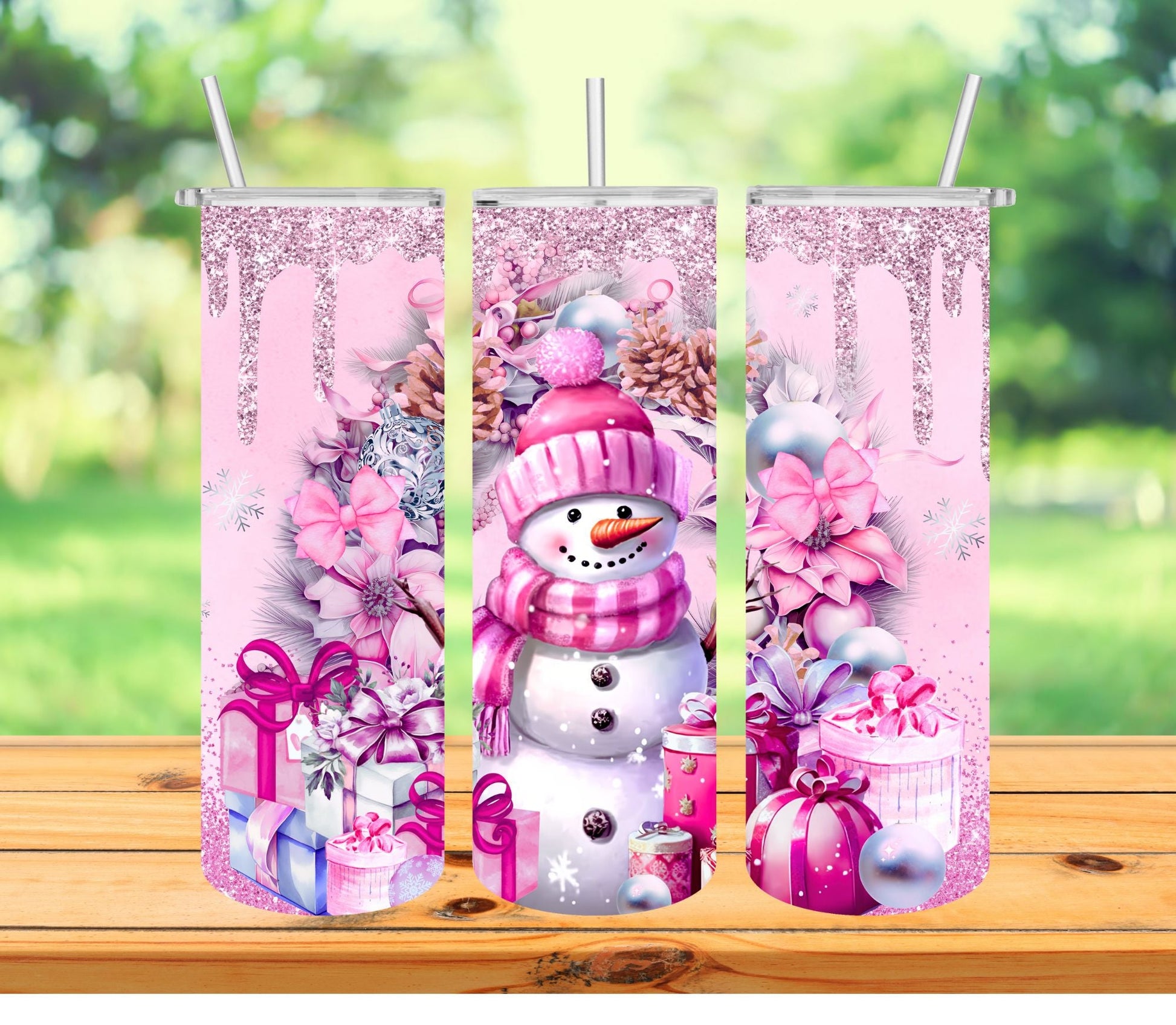 Stay frosty and fabulous with this Pretty in Pink Snowman tumbler! This sparkly, sublimated tumbler is sure to turn heads with its vibrant snowman design and stack of shimmery gifts. Perfect for the winter season!