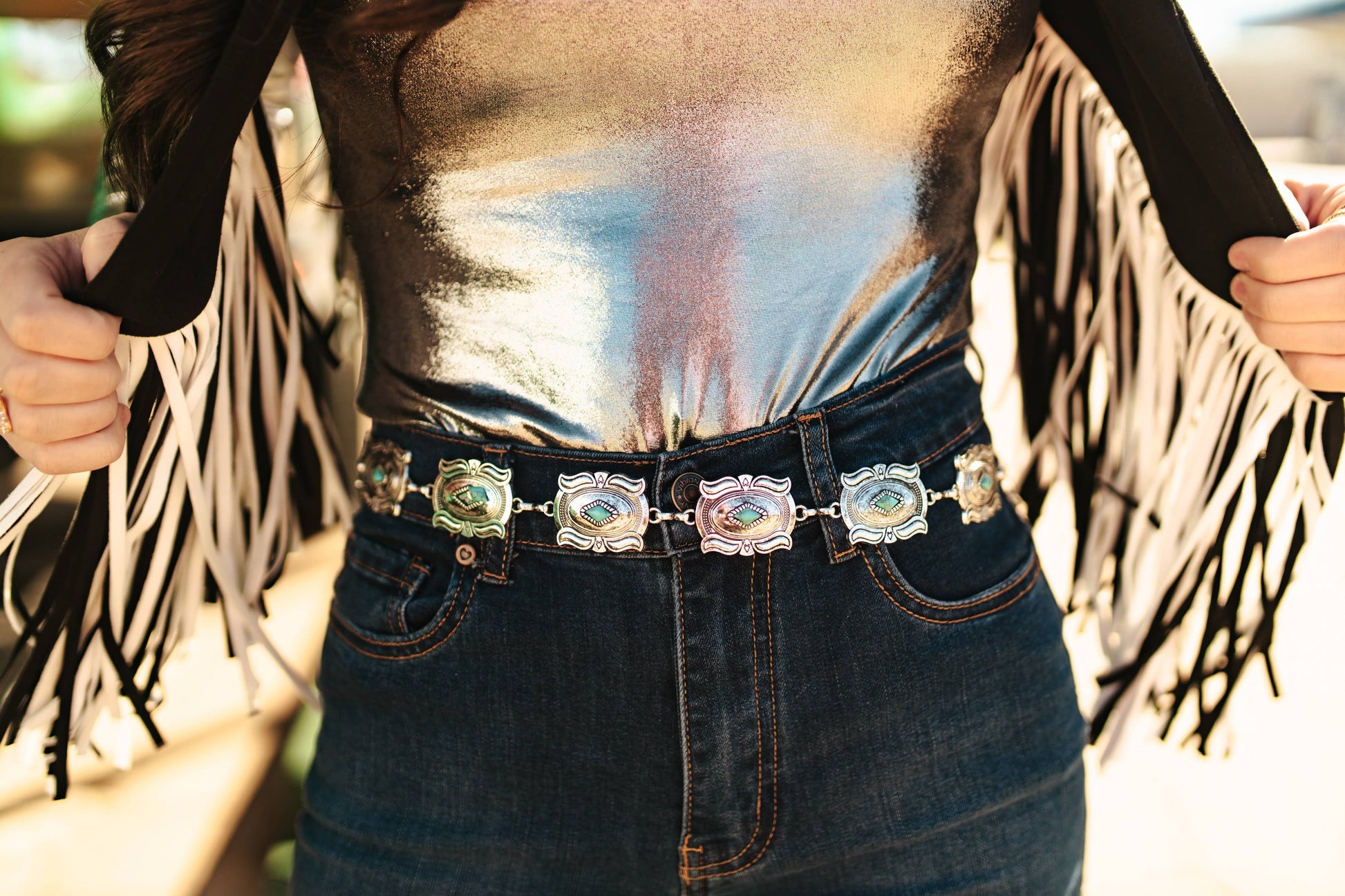 Take a risk and lasso some Western flair for your ensemble! This chic belt boasts striking silvertone and turquoise Concho accents placed along a sleek chain. It's the ideal addition to accentuate your waist and finish off your Western-inspired image.