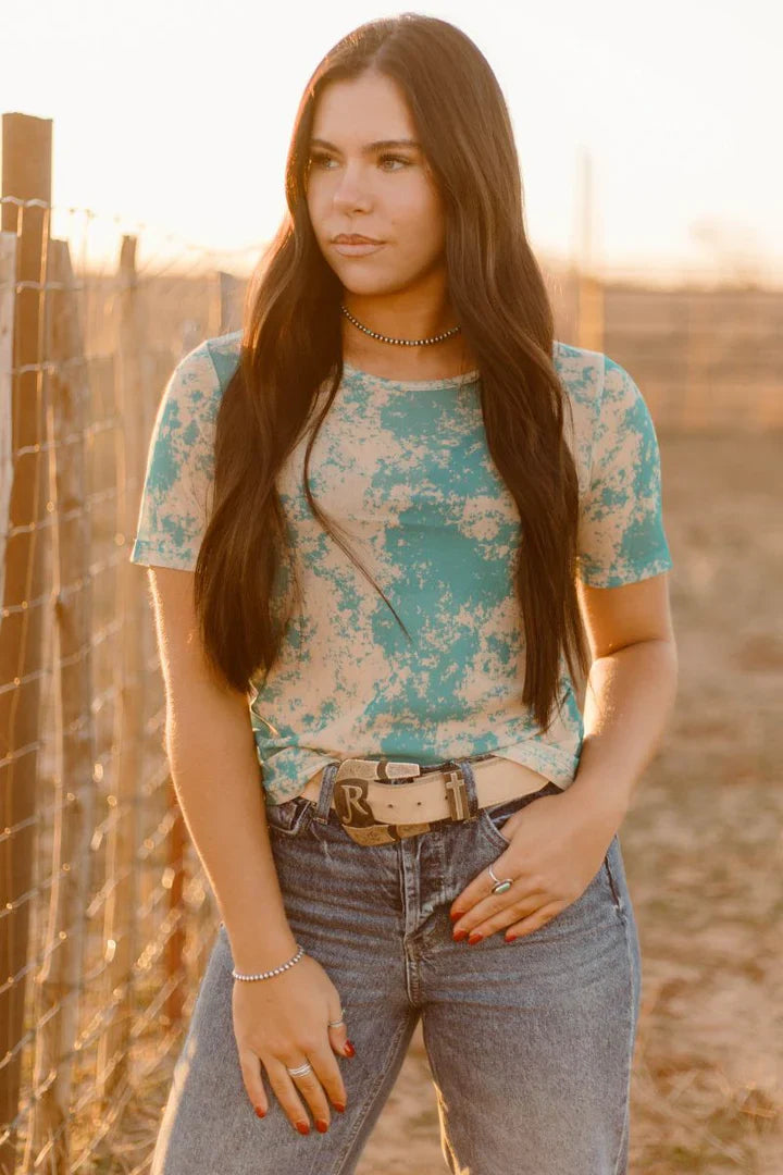 Float down the fashion river in our ROLLIN' RIVER MESH TOP! This turquoise and cream short sleeve top features a low neckline, perfect for showing off your sun-kissed skin. Lightweight and airy, it's the ideal piece for a breezy summer day. Dive in and make a splash with this playful and stylish top!