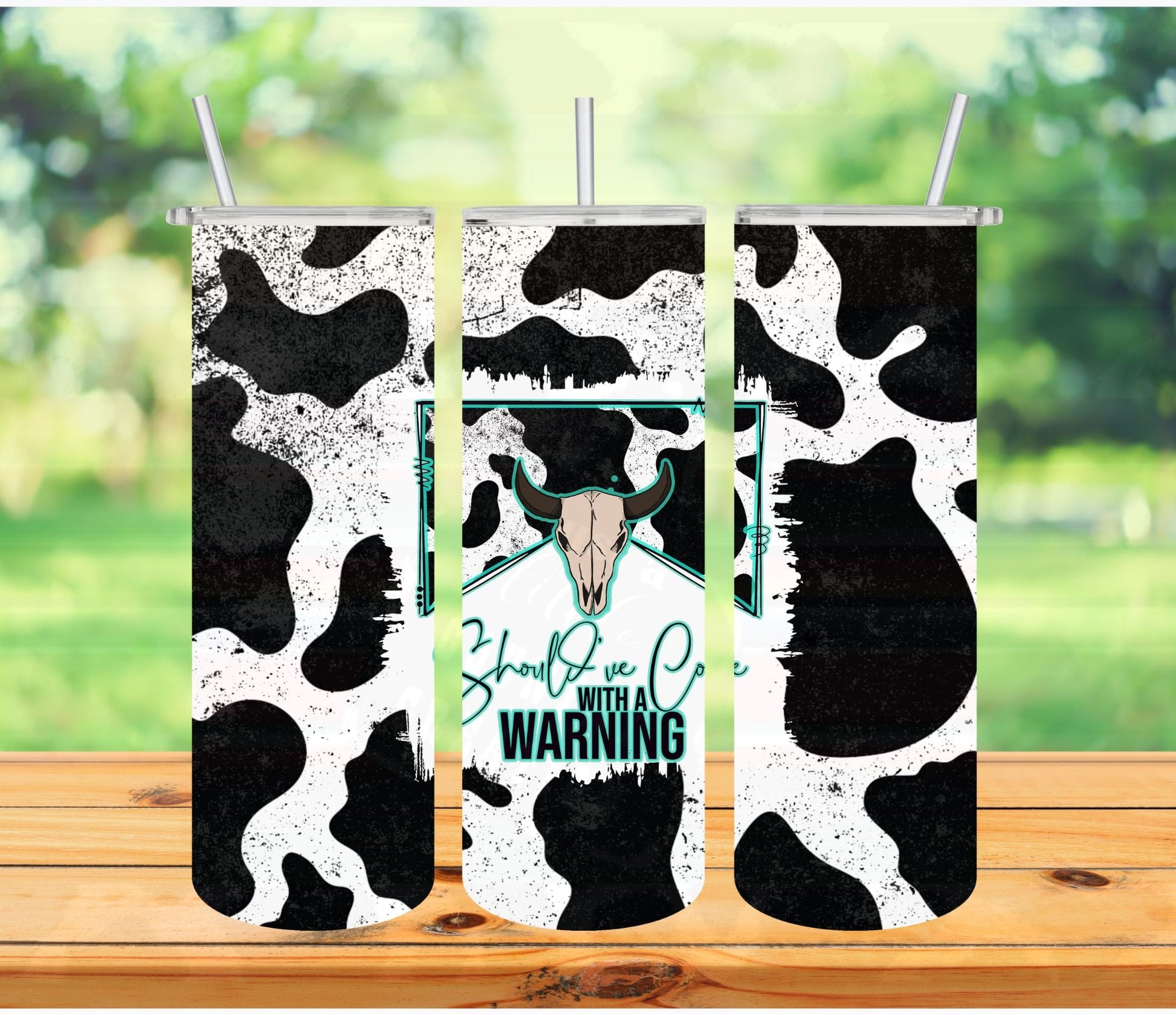 This 20oz tumbler features a cute cow print design with the ominous phrase "Should've Come With a Warning", making it an eye-catching accessory. Double walled and vacuum insulated, it'll keep drinks hot for up to 6 hours and cold drinks cold for up to 10 hours, all without leaving condensation on your desk.