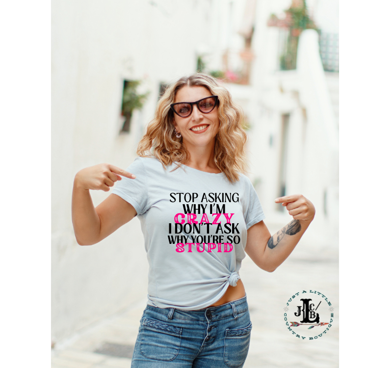 Release your inner sarcasm with our "Stop Asking why I'm crazy!" tshirt. Made with a soft blend material, this shirt will keep you DTF (Down To be Funny) all day long. Say goodbye to boring and embrace the quirky with our playful design.