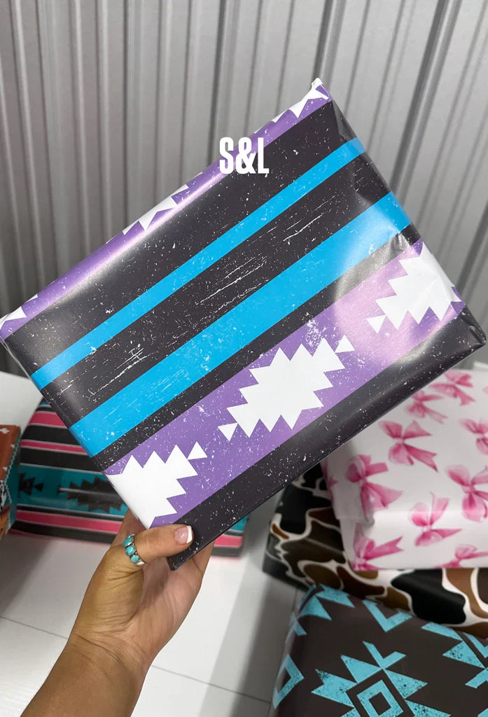 Elevate your gift-giving game with our premium wrapping paper collection! Each package includes 5 generous sheets (70x100cm) of surprisingly sturdy paper that won't tear at the first sign of a corner. Choose from our playful designs: adorable pink bows, teal patch cowboy vibes, purple 90's aztec patterns, striking teal-black aztec prints, fun rodeo collages, pink 90's aztec flair, squash blossoms, or classic camo. These aren't your flimsy dollar-store papers – they're thick enough to handle even the most challenging oddly-shaped presents!